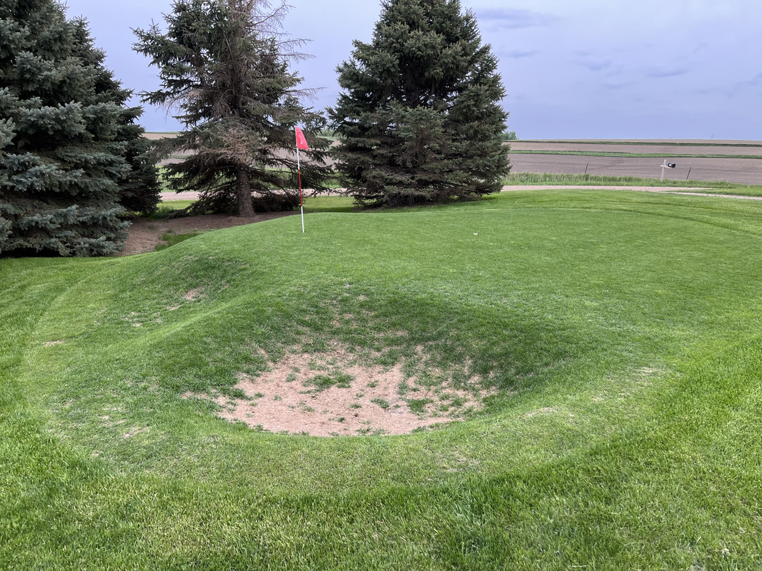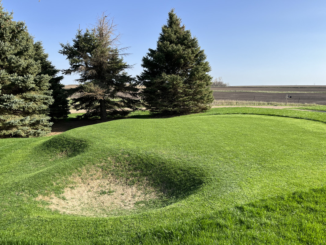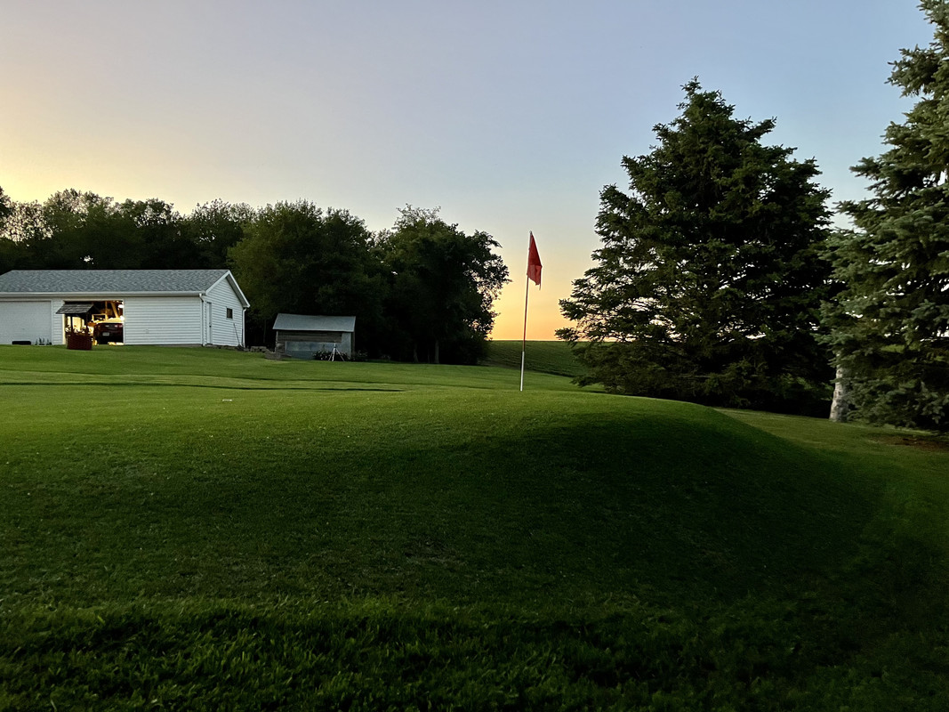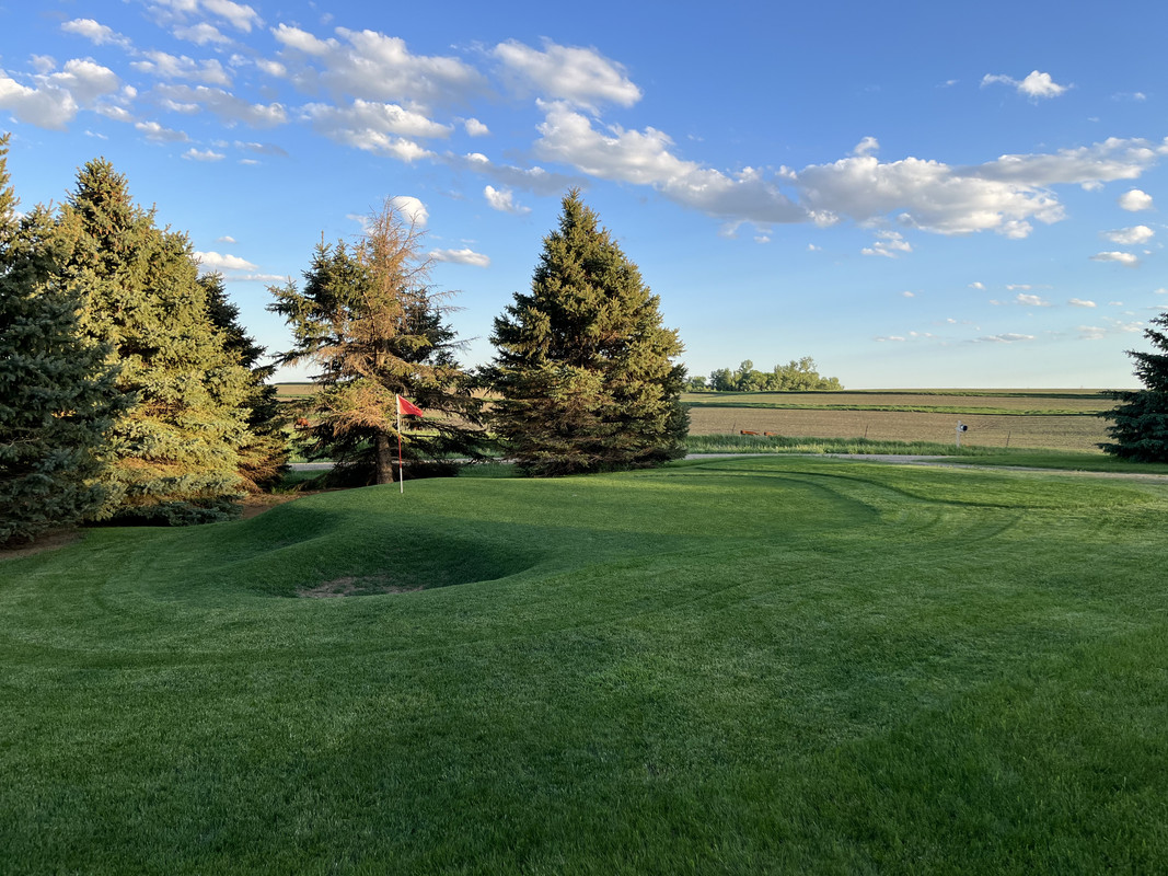 Alors... j'essaierai de faire court pour l'historique. Dakota du Sud, ferme familiale, juin 2020... nous avons une pandémie. J'ai eu la brillante idée de découper une zone de la pelouse pour en faire un trou de golf. Je l'ai rasée à blanc. Moi, le génie, j'ai même étouffé une zone avec du sable en pensant que cela aiderait à niveler la zone autour du trou que j'avais creusé. Bonus : vous pouvez même voir une petite bande de "fairway" que j'ai rasée en haut à droite.