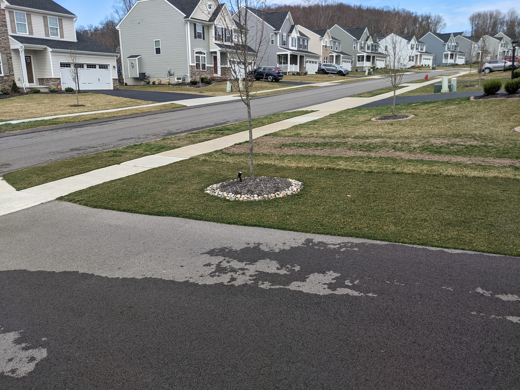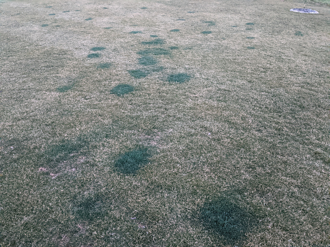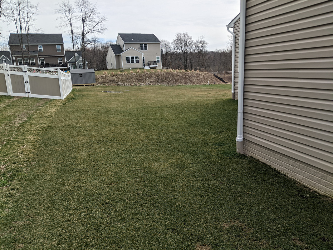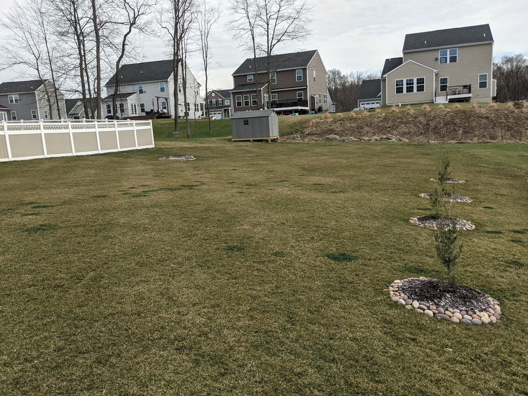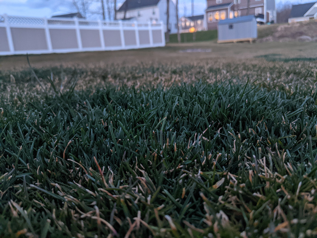 Winter was more harsh that usual this year. Snow was on the ground for most of February. Overall I think the baby grass held up ok - no sign of snow mold. Color loss was significant but expected. I'm in the midst of investigating some spots throughout that are darker and greener than the rest of the yard. I believe it's due to excess nitrogen, either from animal urine or fertilizer burn from last year.