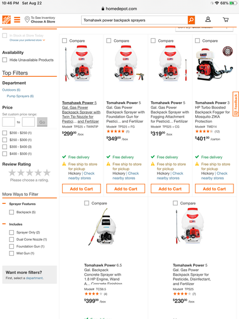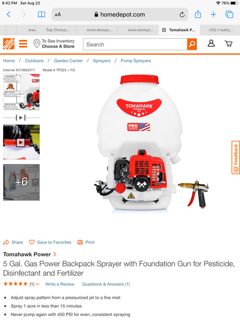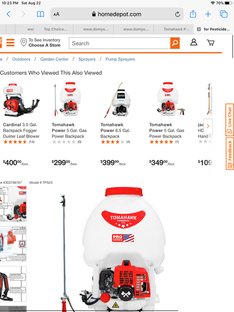It was by chance that I discovered an outfit, Tomahawk Power, is selling gas engine backpack sprayers via Home Depot.