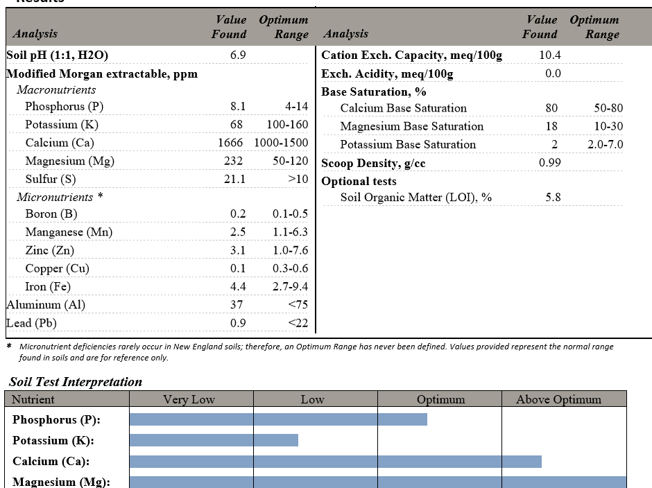 That's a good looking soil test, with the exception of the potassium shortage. Sure doesn't look like a typical New Hampshire soil!