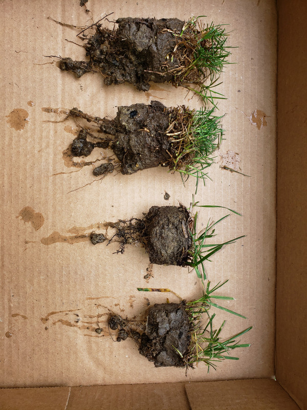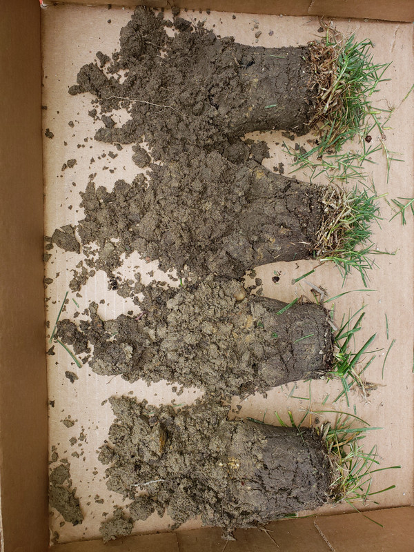 So in between rain drops, I took 2 core samples from my front yard which I've been religiously applying humic acid (Humic DG, Air8 and Humic 12) since January and 2 cores from my side and back yard which I haven't touched.