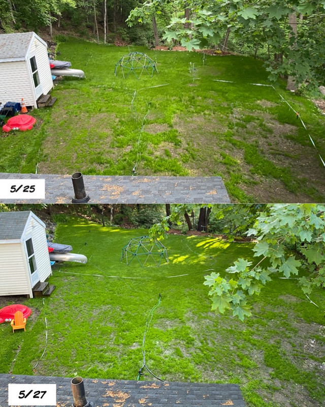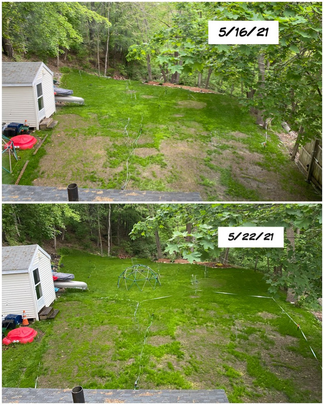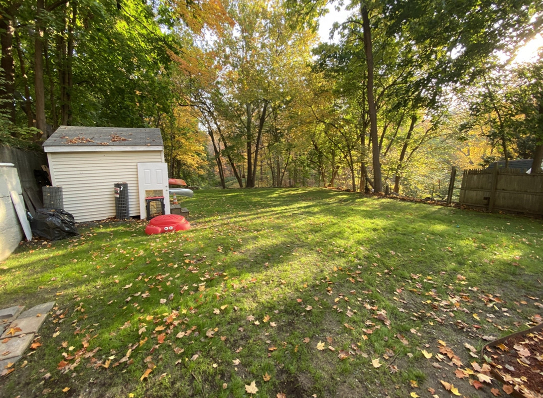 Fall 2020...... we tried again.... but were taken out by the leaves, we have a ton of Norway maples, and catalpa trees that have ENORMOUS leaves, and the rest of the trees are sugar maple.. I know in this picture it looks so pretty, quintessential New England. But this was basically less then an hour after leaf blowing the whole yard. The leaves just buried the brand new grass.