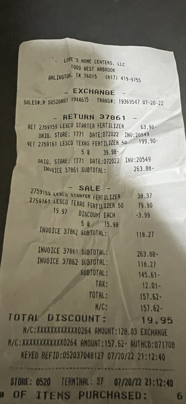 I also bought 5 of these too! I can't help the big on sale sign. I got this product for 19$ is it any good or should I return it!FATC1TY said:Pushing that much N isn't ideal going into the fall. You want to bolster up the P and K if needed going into the cooler weather. Spring application of it is again too much N, unless you are prone to missing the window for warm season grasses. It works great for the average big box store. They are the spring weeds start up, or see the the fall/winter weeds still hanging around, apply it in April and may, and get this boost of growth and green and love it.Boomhauer said:I'm confused, why is it bad to push N with pre emergent? Is it because the grass isn't actively growing at the stArt of the spring season or something else? I use it as my fall application since it's still actively growing through October.FATC1TY said:Worthless product IMO. You don't want that much nitrogen at any point for a warm season grass when you'd be putting down your pre-emergent.