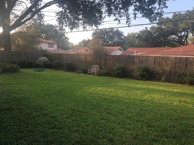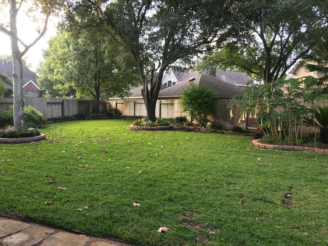 - Back lawn size and grass: ~1500 sqft, 100% Floratam SA