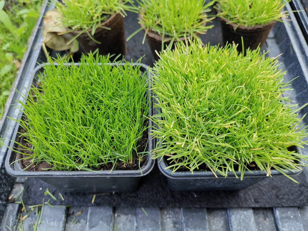 Just got back from a 10 day holiday and took a look at the Tetris KBG and Rye pots. Images below. The lone pot with darker leaves is my Tetris test. The others are a blend of Rye.
