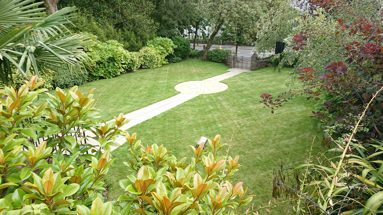 130m2/1400 sqft lawn split into front section of 600sqft/55m2 and back section of 800sqft/75m2.