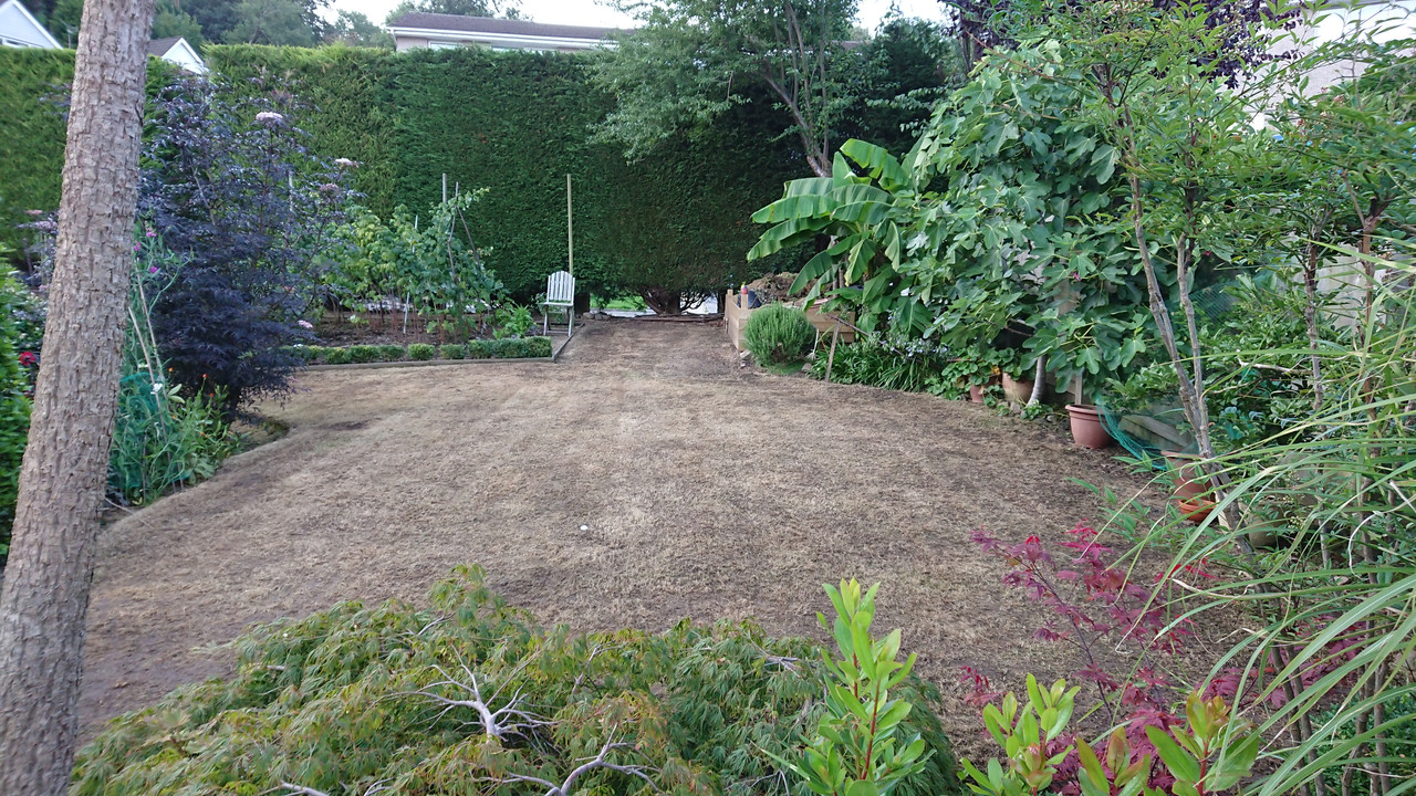 Mid July. Thought it would be a good idea to scarify the reno area (back lawn) to clear some debris and dead grass from the surface area of this 50 year old grass/weed mix. Should have used the dethatcher attachment (thinner tines) rather than the blades because it probably wouldn't have been quite so invasive! Who cares, its being reno'd but anyway it left patchy grass with plenty of dead looking areas. Probably would have been better to apply the roundup/glykill to very well growing grass. Hey, I'm not stewing over it. Its recovered some.