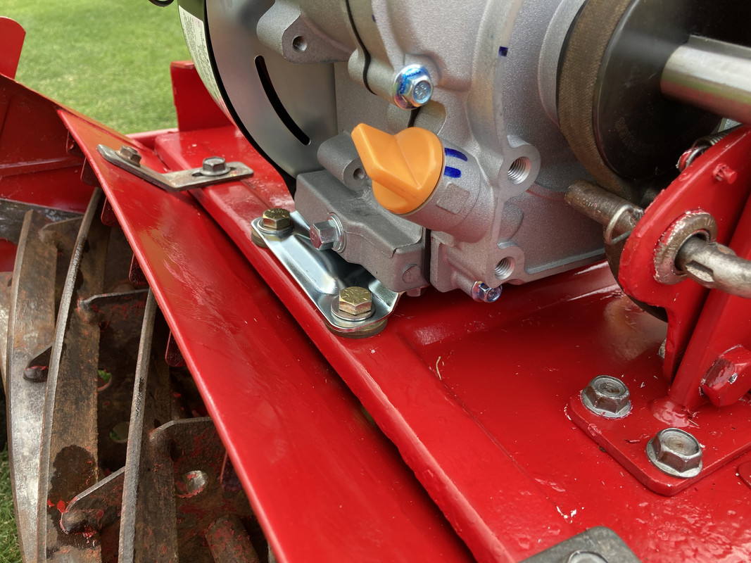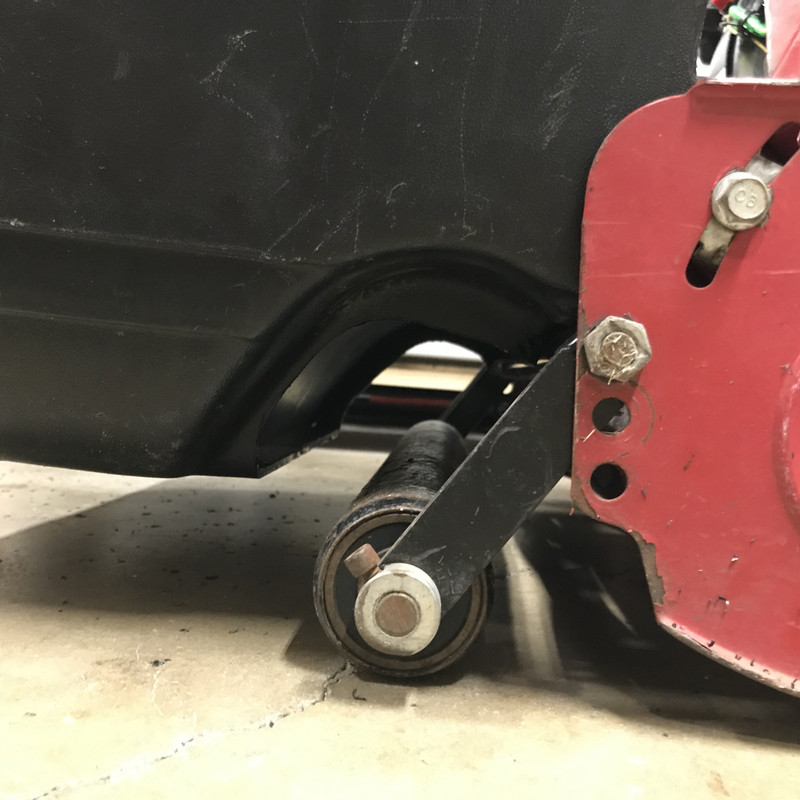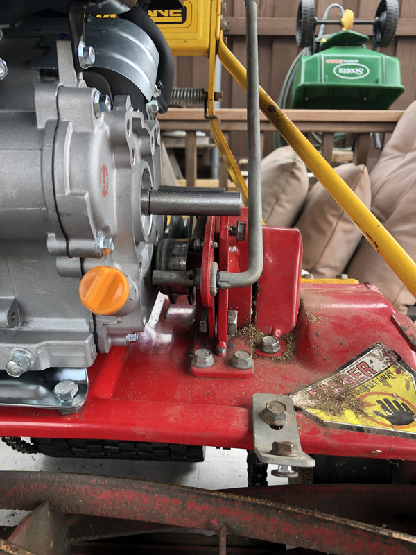 Misc: If you use this particular motor you'll need some kind of spacer equaling about 1/2" shown in pic below. That bar hits the bottom of the air cleaner. You also need a longer bolt here as well. The new pulley was hitting part of the assembly and engaged the clutch so I needed to raise the motor. I raised it just over 1/2" with two nuts and a washer. Putting the bolts through the motor and then threading nuts on was much easier then trying to get the bolts through a stack of 8 washers. I used 2.5" bolts for mounting the motor. Again with this particular motor I needed to trim on of the mounting bolts to about 1.9" (still needed a hammer to tap it in a bit too). It would be the drive side back bolt that needs to be trimmed down.