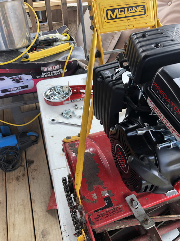 Worst part of the whole thing was getting the shroud that goes around the reel back on. Put gas and oil in the motor and it fired on the second pull. Going from an old 3HP motor to a new 6.5HP motor is a huge difference. It had been 5 days since I last mowed (replacing the mower took me 2 days) and the grass was wet from watering and it didn't even bat an eye. Just plowed right through it. The new motor is quite a bit heavier too. So that's a plus.