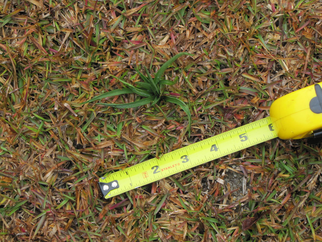 The reason I am telling all the above is....... look closely at the pic above with the Kyllinga. I had a couple of hard frost mid December and it sent the grass semi-dormant. Late December, early January the grass started to green up and even grow a little. The Kyllinga was coming out quite well and growing pretty good. I mixed up my 50-50 glyphosate and carefully applied a stream to all the Kyllinga and the mystery weed mid January. In the pic above you can see the Kyllinga may have died but the other weed is still green. And all that Kyllinga treatment through out the summer/fall did nothing to the mystery weed. The sedge control did nothing to the mystery weed.