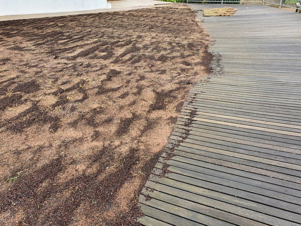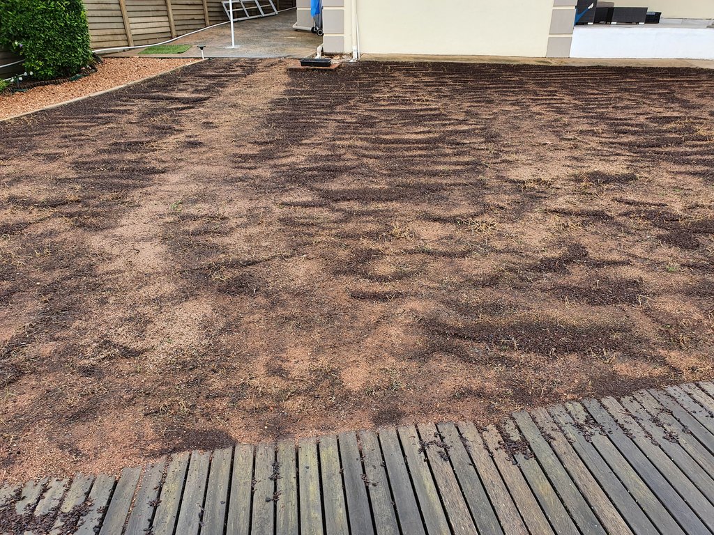 Good day. I'm on day 12 of my newly seeded lawn and we had a very heavy rain storm resulting in damage. What should I do now. Do I rake it level or use a roller and level it?