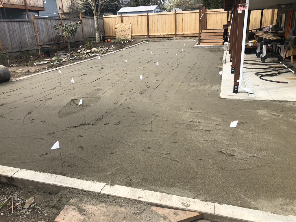 Now it was time to rough subgrade and set grade stakes. I ran string lines every 8' from perimeter curb to patio slab and marked each grade stake 1/2" below my string line so I had plenty of room for future Topdress. I also dropped some Simplot Lime and Planet Turf for nutrients and a Carbon Source.