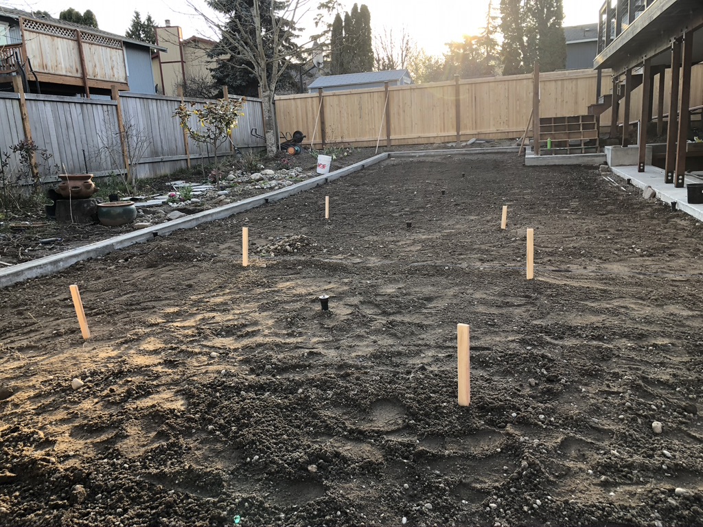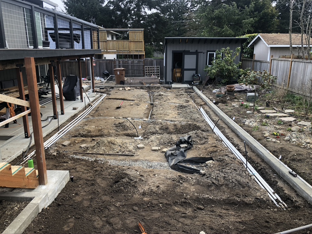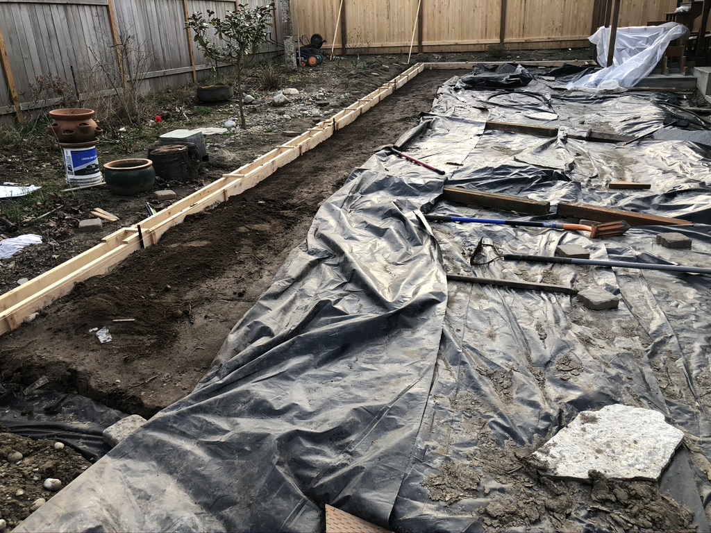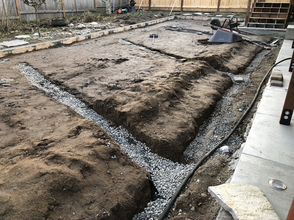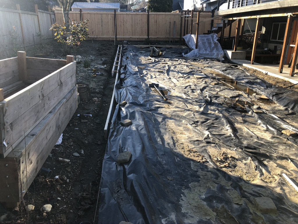 After removing 6" plus of my none draining clay I covered the whole area with 6 mil. plastic. This plastic would not move much for the next 2 months. While the PNW rain fell as it does often in the winter months I started drawing irrigation, subgrade drain, and perimeter curb.