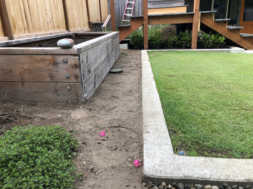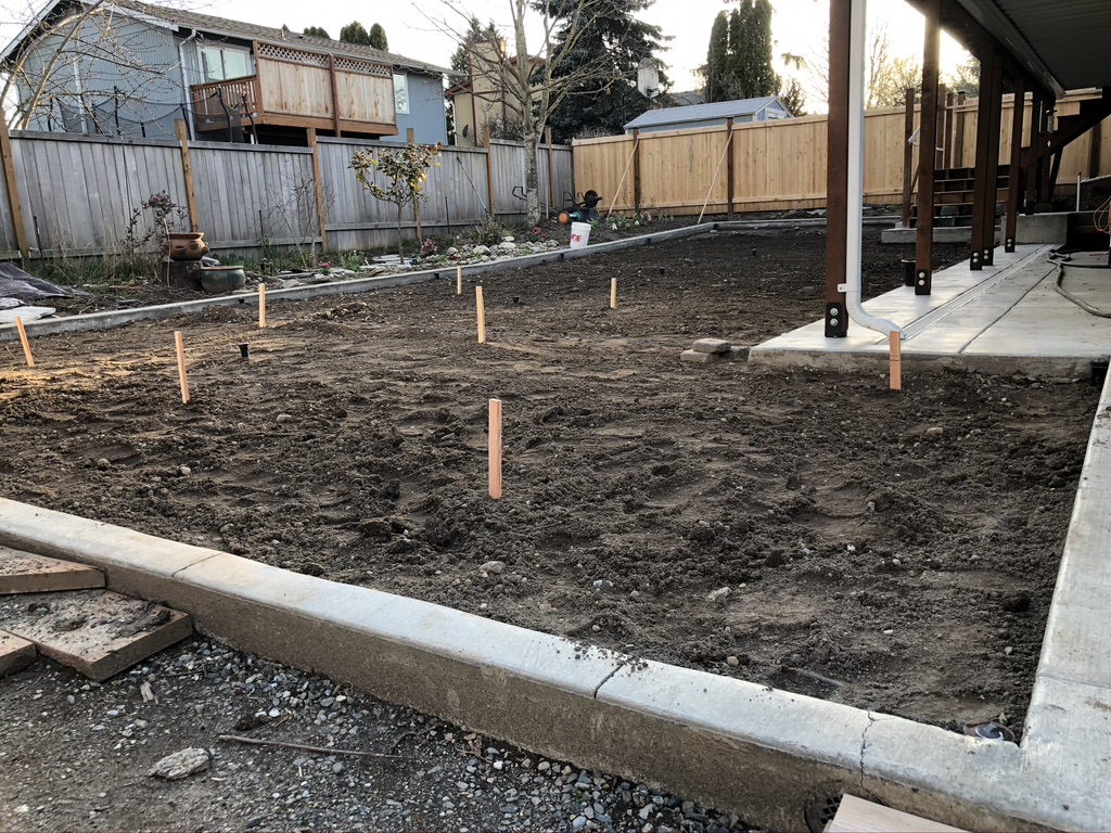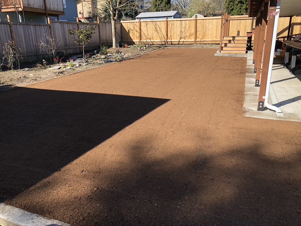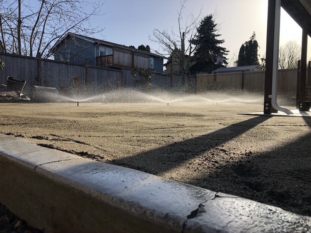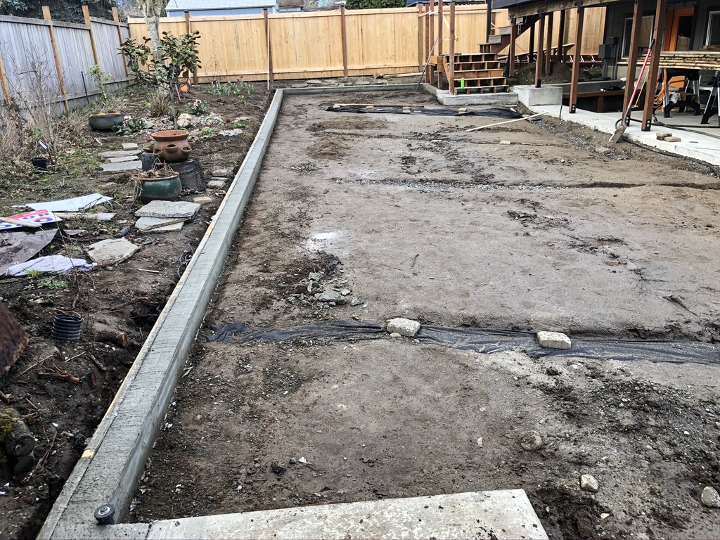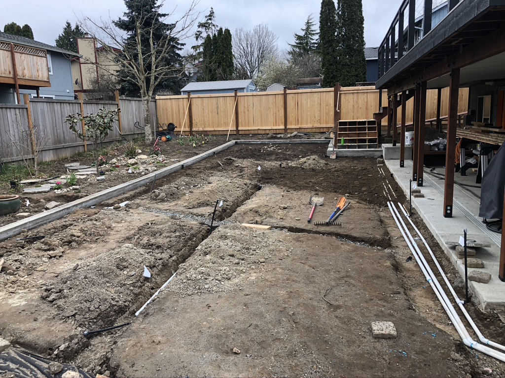 After removing 6" plus of my none draining clay I covered the whole area with 6 mil. plastic. This plastic would not move much for the next 2 months. While the PNW rain fell as it does often in the winter months I started drawing irrigation, subgrade drain, and perimeter curb.
