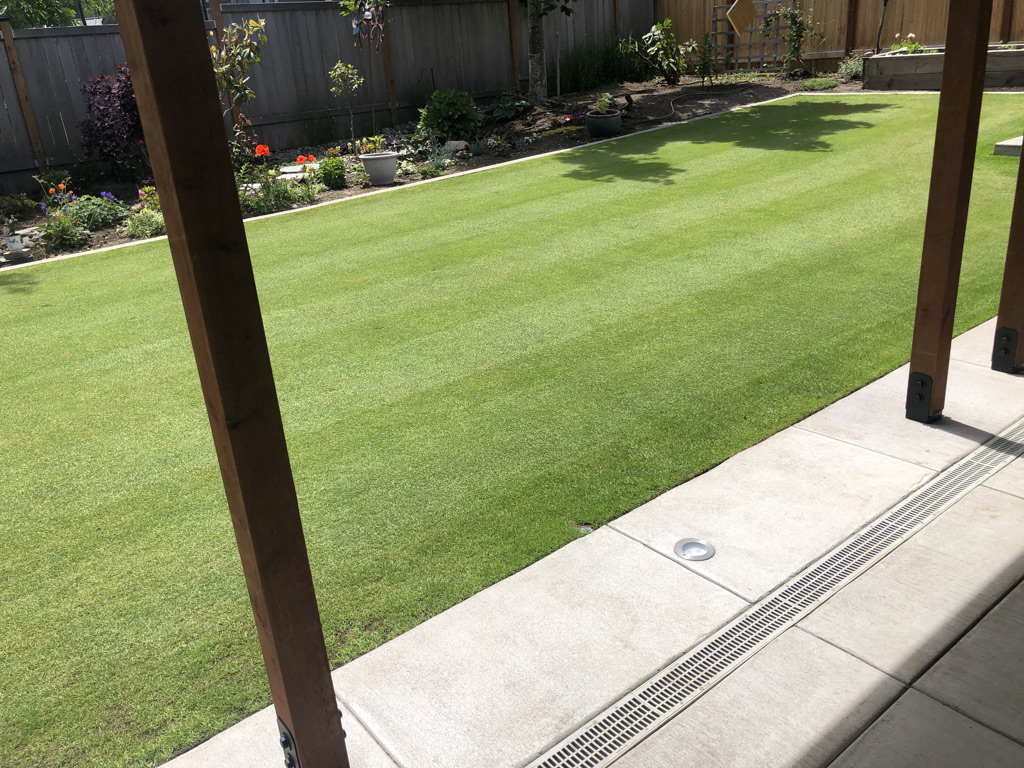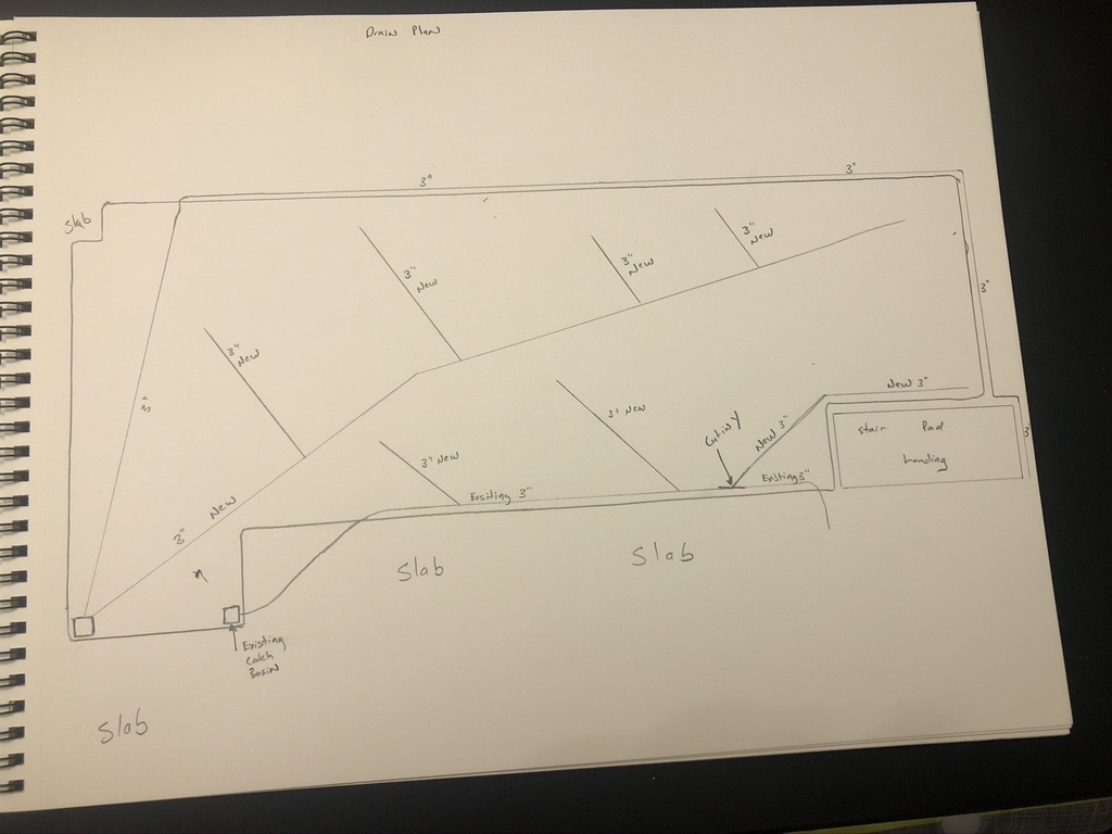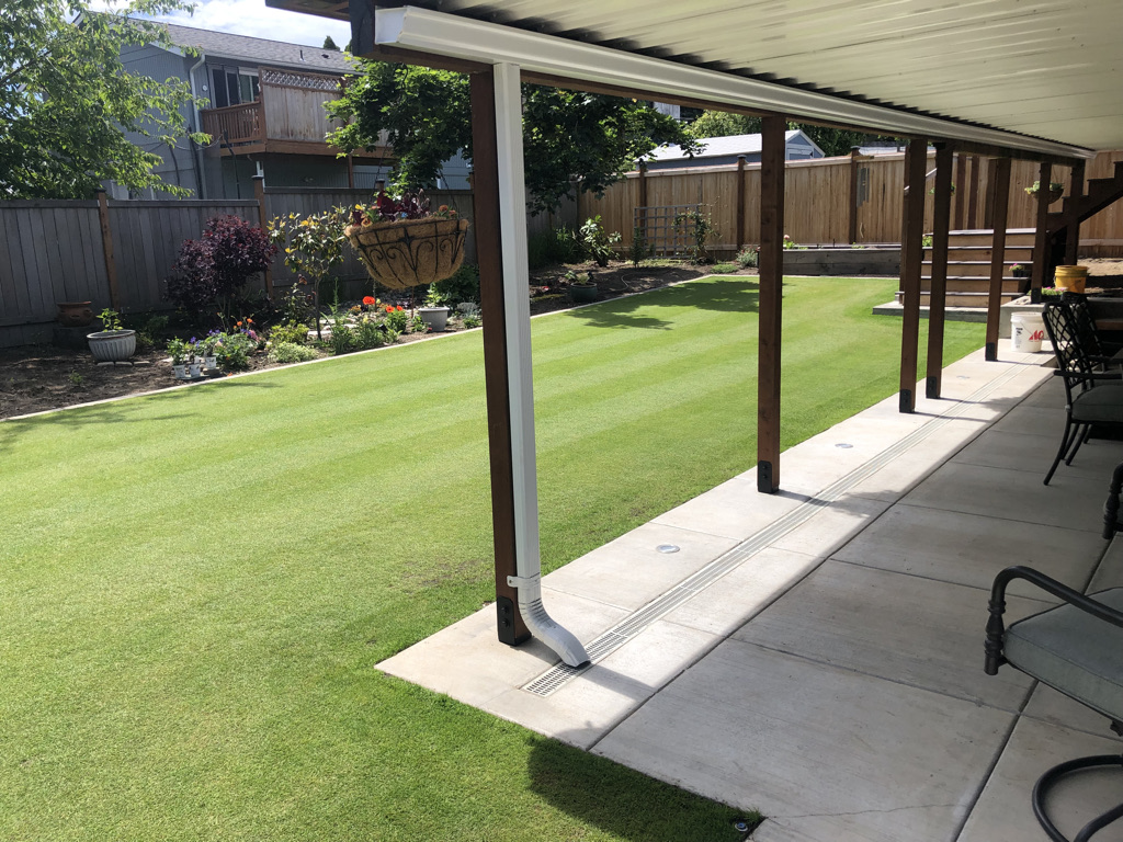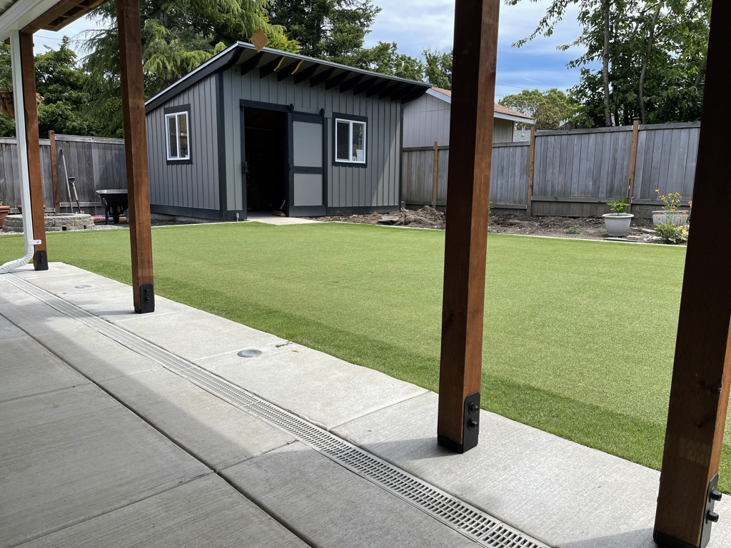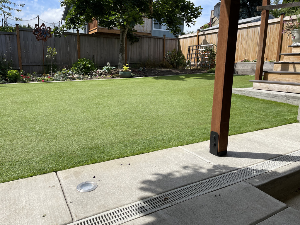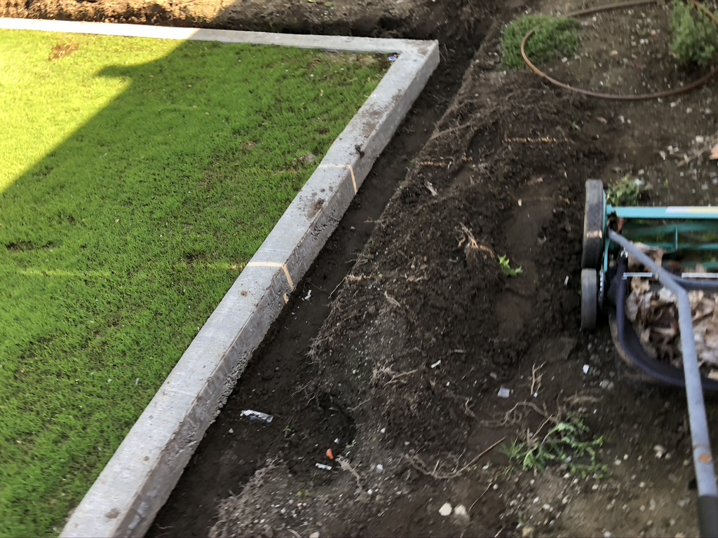 A few pictures before there was a photo of a end of 4" perf pipe about 16" below another curb I poured last summer when i built a new patio slab under our deck. That 4" perf leads to a 6" perf pipe that my neighbor and I put in a few years ago that leads back to the street. So that 4" connection is where I wanted to tie all my "fishbone" drainage to. I installed a total of 200" of wrapped 3" perf pipe that all lead to that 4" connection. Roughly 130' inside the turf area and another 70' that is just outside the perimeter curb.