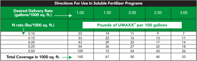 Pour 0,50 lb de N par 1 000 pieds carrés, je diviserais les 54 lb d'urée par 100 gallons pour obtenir 0,54 lb ? Voir le tableau.